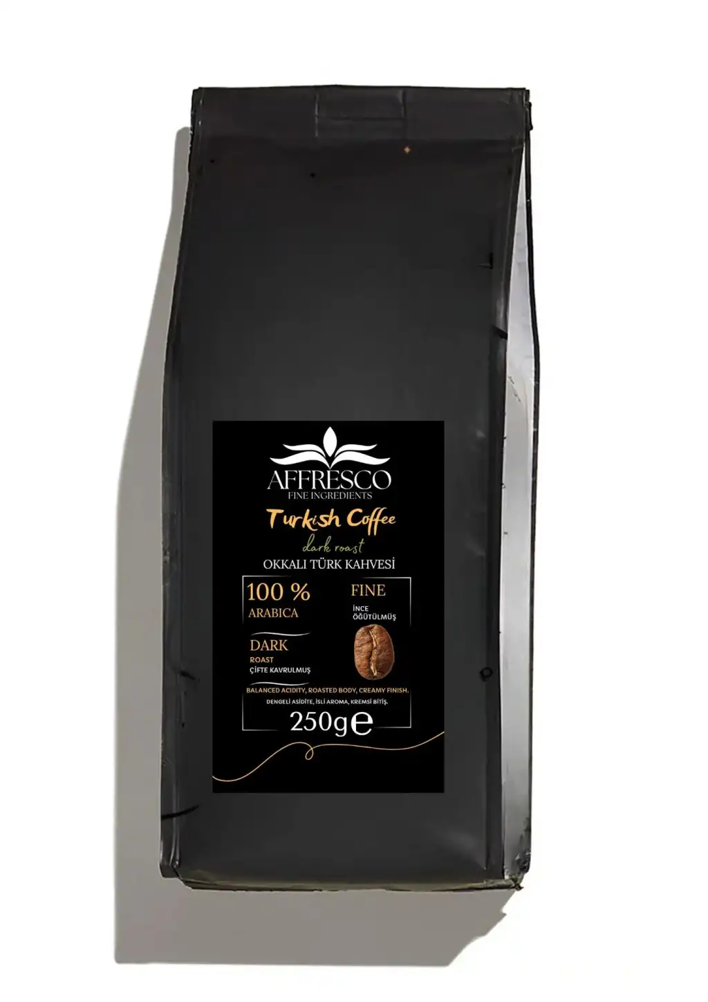 Affresco Okkalı Türk Kahvesi, seçkin %100 Arabica çekirdeklerinden üretilmiş, güçlü ve karakteristik bir tat arayanlar için ideal, 250 gramlık Doypack paket içinde sunulan özel bir Türk kahvesidir.